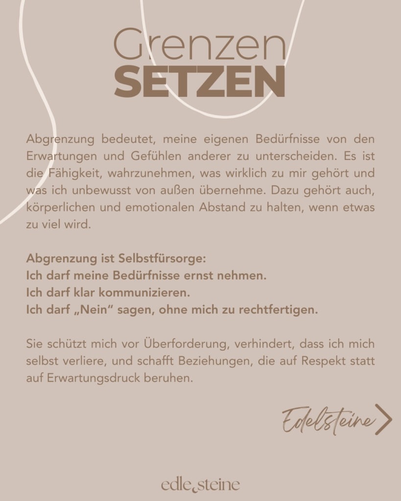 Grenzen sind keine Wand. Sie sind ein Wegweiser. Sie zeigen dir, wo du aufhörst und wo jemand anderes beginnt. Sie schützen deine Energie. Deine Zeit. Deine mentale Gesundheit. Deinen Raum. Und sie sorgen dafür, dass Beziehungen ehrlich bleiben. Denn wenn du dich ständig anpasst, entsteht keine echte Nähe – nur stille Erschöpfung.