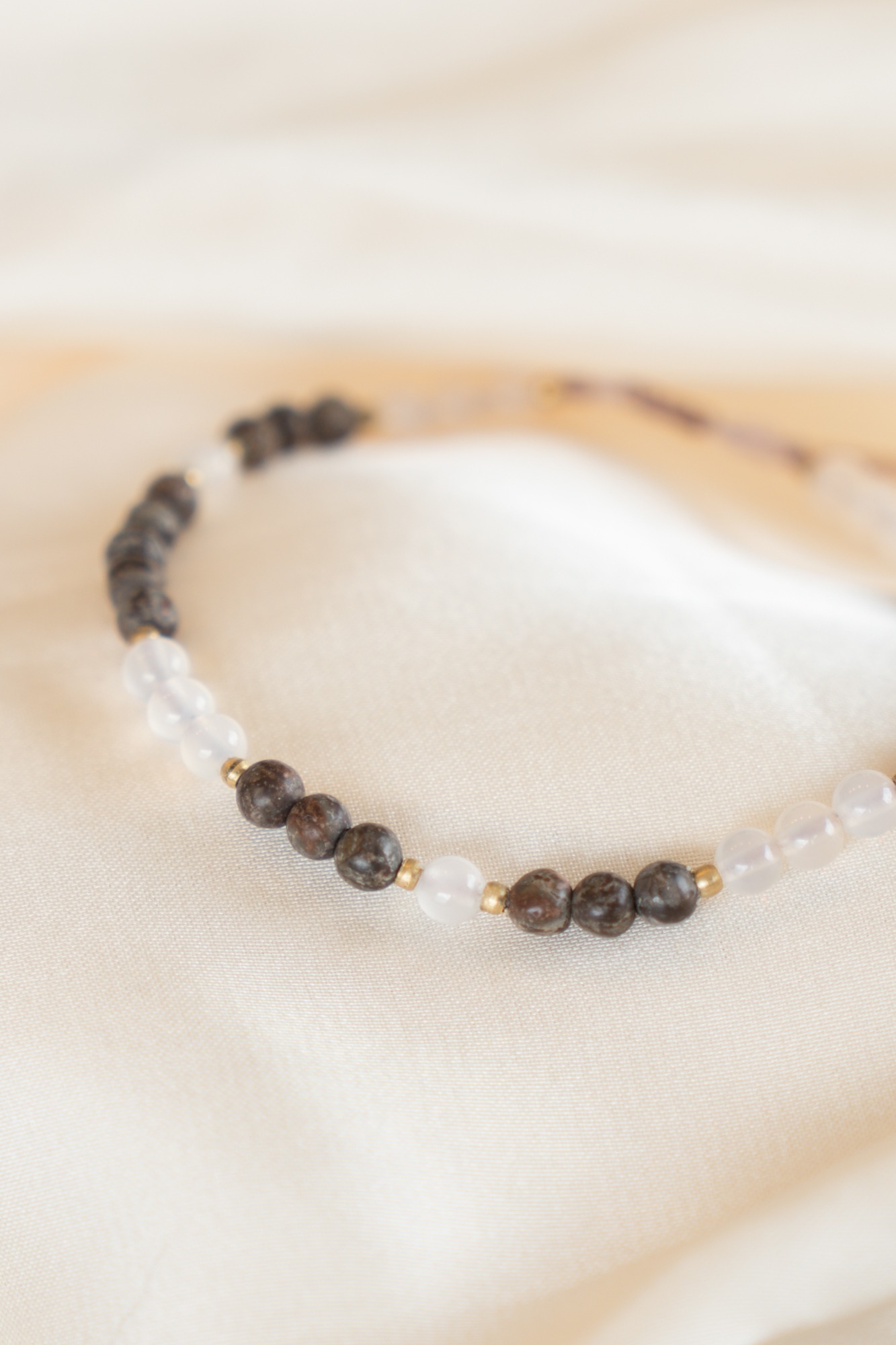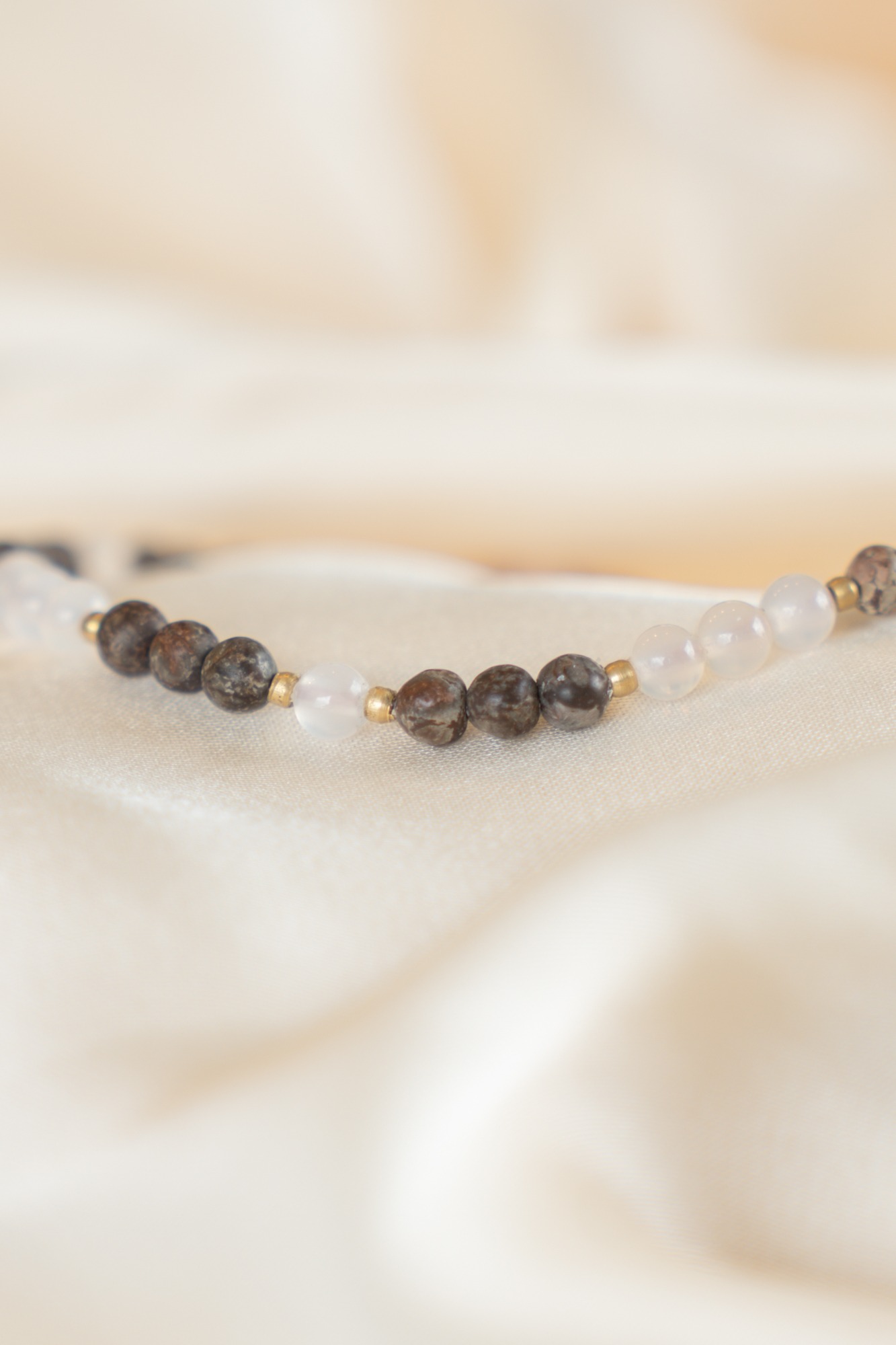 Achat gehört zur Familie der Quarze und bildet sich in Hohlräumen vulkanischen Gesteins. Er wächst in Schichten, wodurch seine typischen feinen Linien und Ringe entstehen – jede ein Zeugnis von Zeit, Ruhe und Wandlung. Schon in der Antike galt Achat als Schutzstein, besonders gegen negative Einflüsse und zur Stärkung innerer Strukturen. Spirituell steht Achat für Stabilität und Balance – er verbindet Körper und Geist, das Persönliche mit dem Kollektiven, das Ich mit dem Wir.