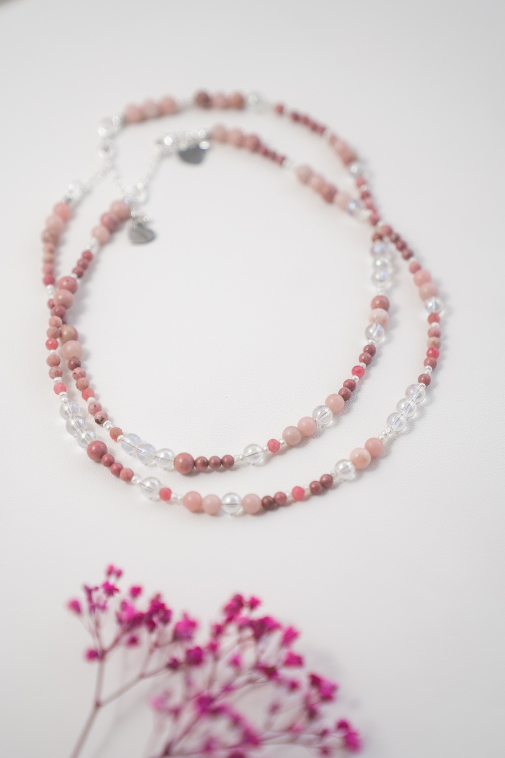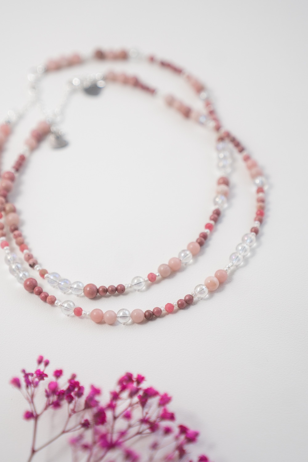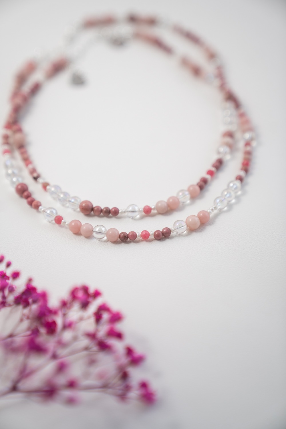 Sie begleitet dich in Phasen, in denen du Altes loslassen möchtest, ohne bitter zu werden. In Momenten, in denen du spürst, dass Empfindsamkeit keine Schwäche ist, sondern Bewusstheit. Aurora steht für Zuneigung zu dir selbst, für Klarheit in deinen Gefühlen und für die Fähigkeit, dich nicht zu verschließen, auch wenn du viel wahrnimmst. Das schimmernde Angel Aura bringt Weite und geistige Leichtigkeit. Andenopal Rosa trägt Lebenskraft und Individualität. Rhodonit steht für Herzöffnung, Vergebung und innere Kraft. Die Süßwasserperle schenkt Würde, Tiefe und eine stille Präsenz.