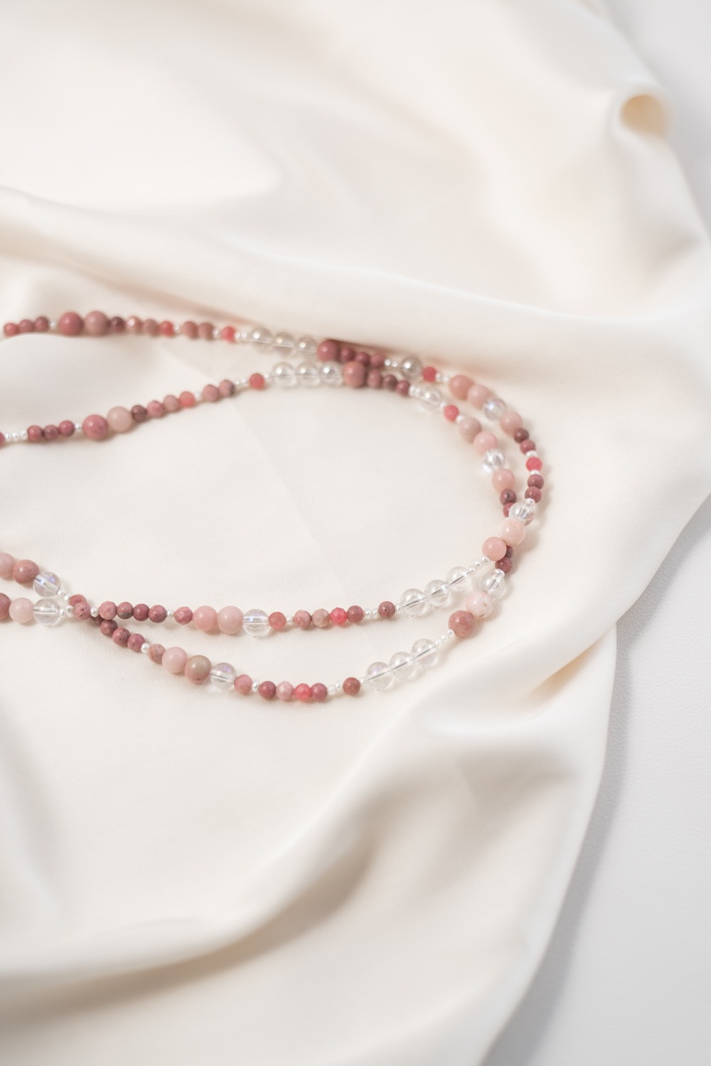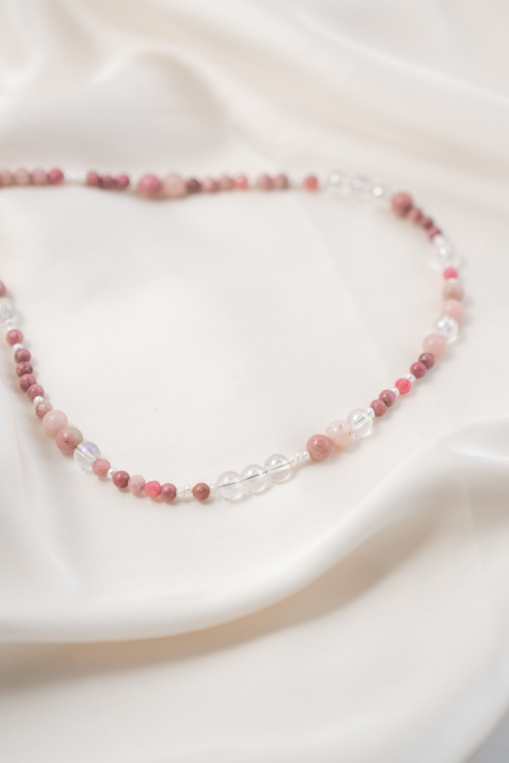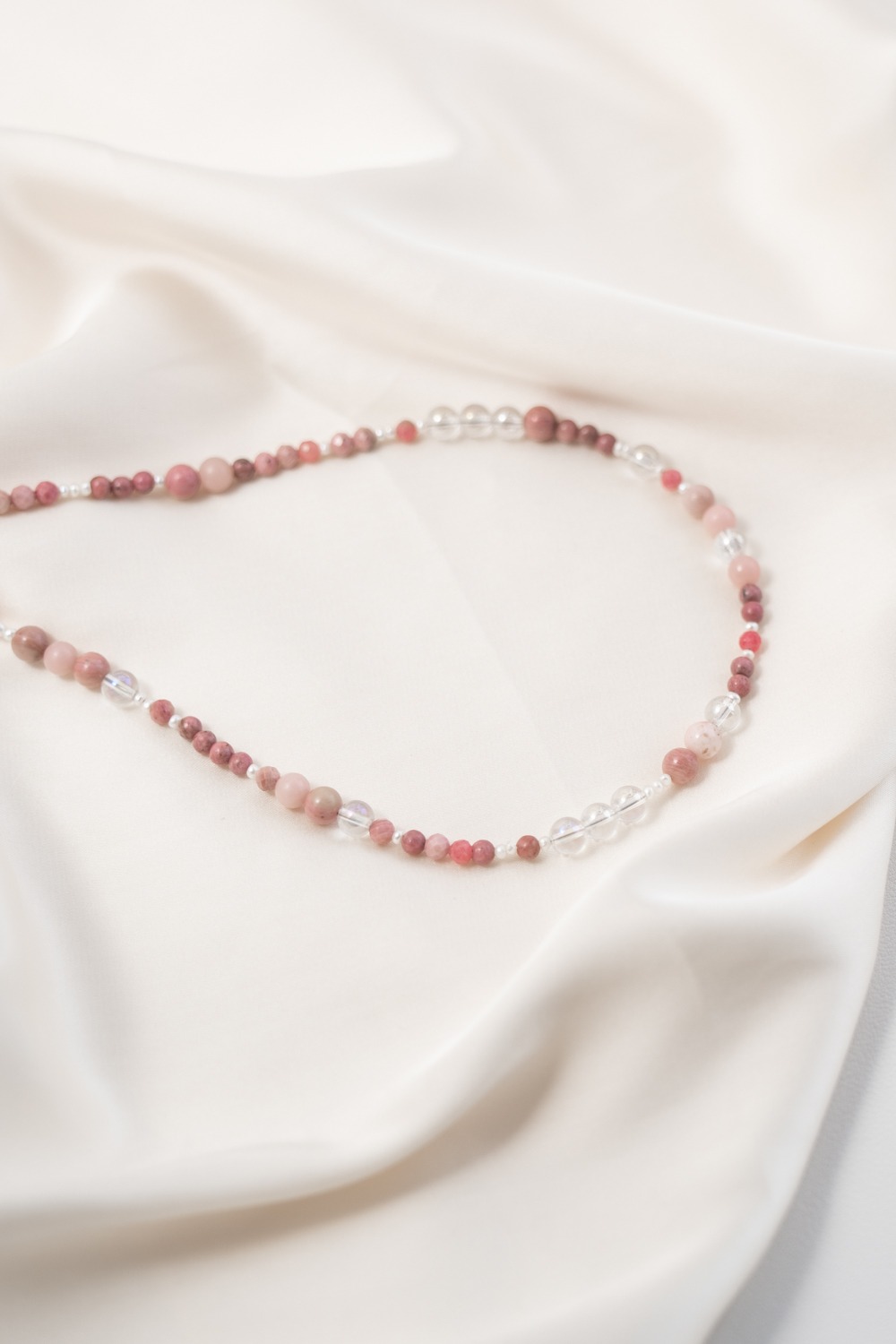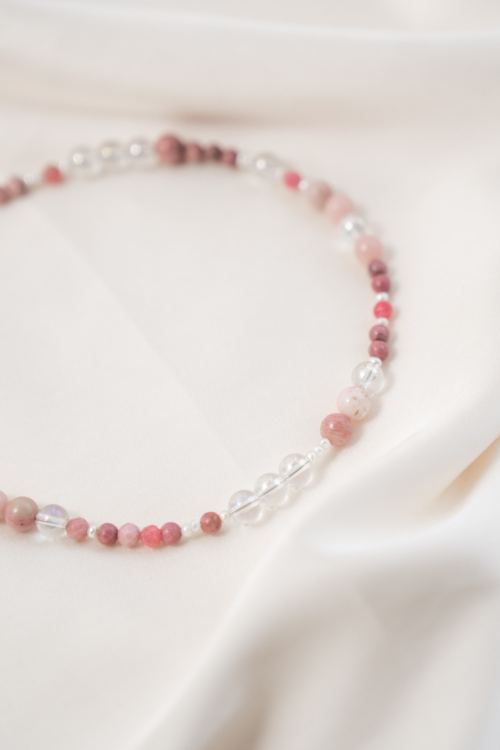 Sie begleitet dich in Phasen, in denen du Altes loslassen möchtest, ohne bitter zu werden. In Momenten, in denen du spürst, dass Empfindsamkeit keine Schwäche ist, sondern Bewusstheit. Aurora steht für Zuneigung zu dir selbst, für Klarheit in deinen Gefühlen und für die Fähigkeit, dich nicht zu verschließen, auch wenn du viel wahrnimmst. Das schimmernde Angel Aura bringt Weite und geistige Leichtigkeit. Andenopal Rosa trägt Lebenskraft und Individualität. Rhodonit steht für Herzöffnung, Vergebung und innere Kraft. Die Süßwasserperle schenkt Würde, Tiefe und eine stille Präsenz.