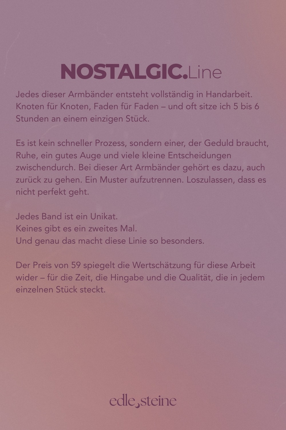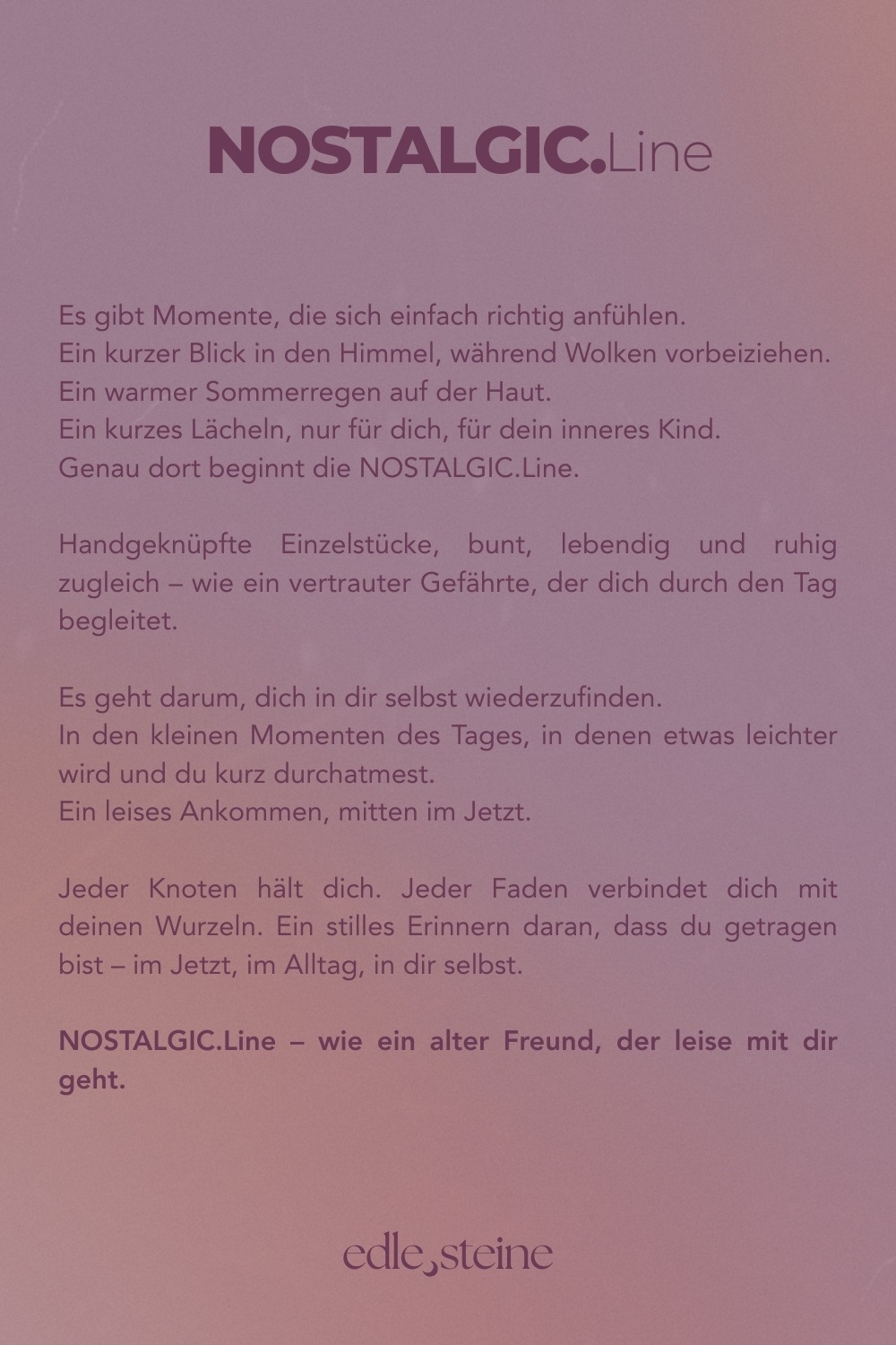 Es gibt Momente, die sich einfach richtig anfühlen: ein kurzer Blick in den Himmel, während Wolken vorbeiziehen, ein warmer Sommerregen auf der Haut, ein kleines Lächeln, das du nur mit deinem inneren Kind teilst. Genau dort beginnt die NOSTALGIC.Line. Handgeknüpfte Einzelstücke, bunt, lebendig und ruhig zugleich – wie ein vertrauter Gefährte, der dich durch den Tag begleitet. Es geht darum, dich in dir selbst wiederzufinden, in den kleinen Momenten des Tages, in denen etwas leichter wird und du kurz durchatmest. Ein leises Ankommen, mitten im Jetzt. Jeder Knoten hält dich, jeder Faden verbindet dich mit deinen Wurzeln – ein stilles Erinnern daran, dass du getragen bist, im Jetzt, im Alltag, in dir selbst. NOSTALGIC.Line – wie ein alter Freund, der leise mit dir geht.