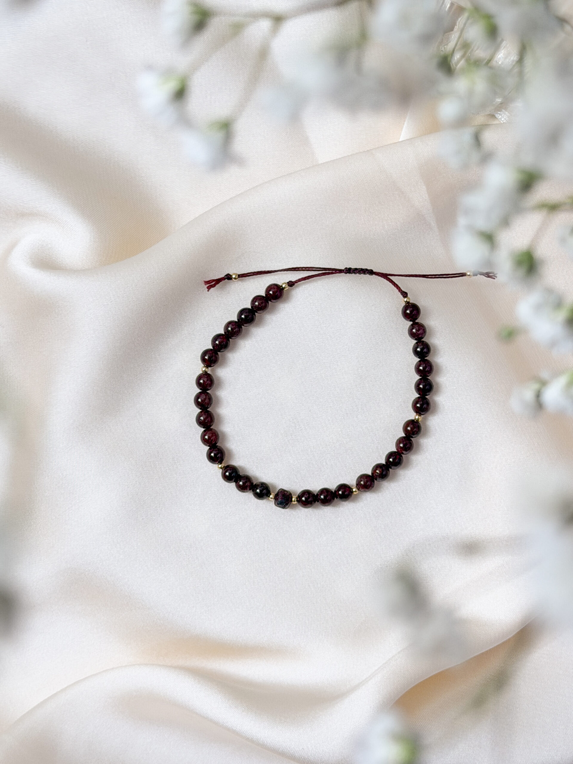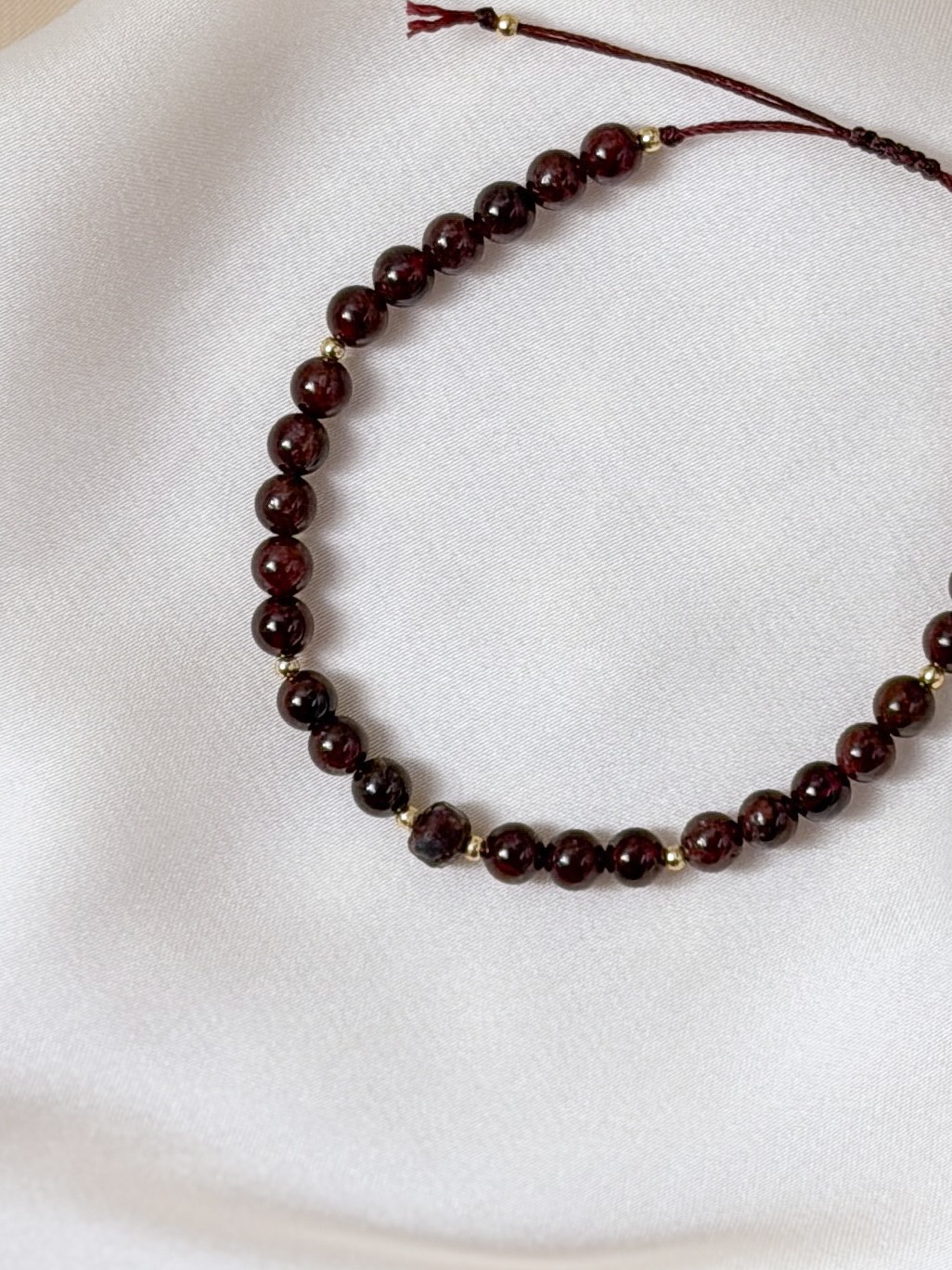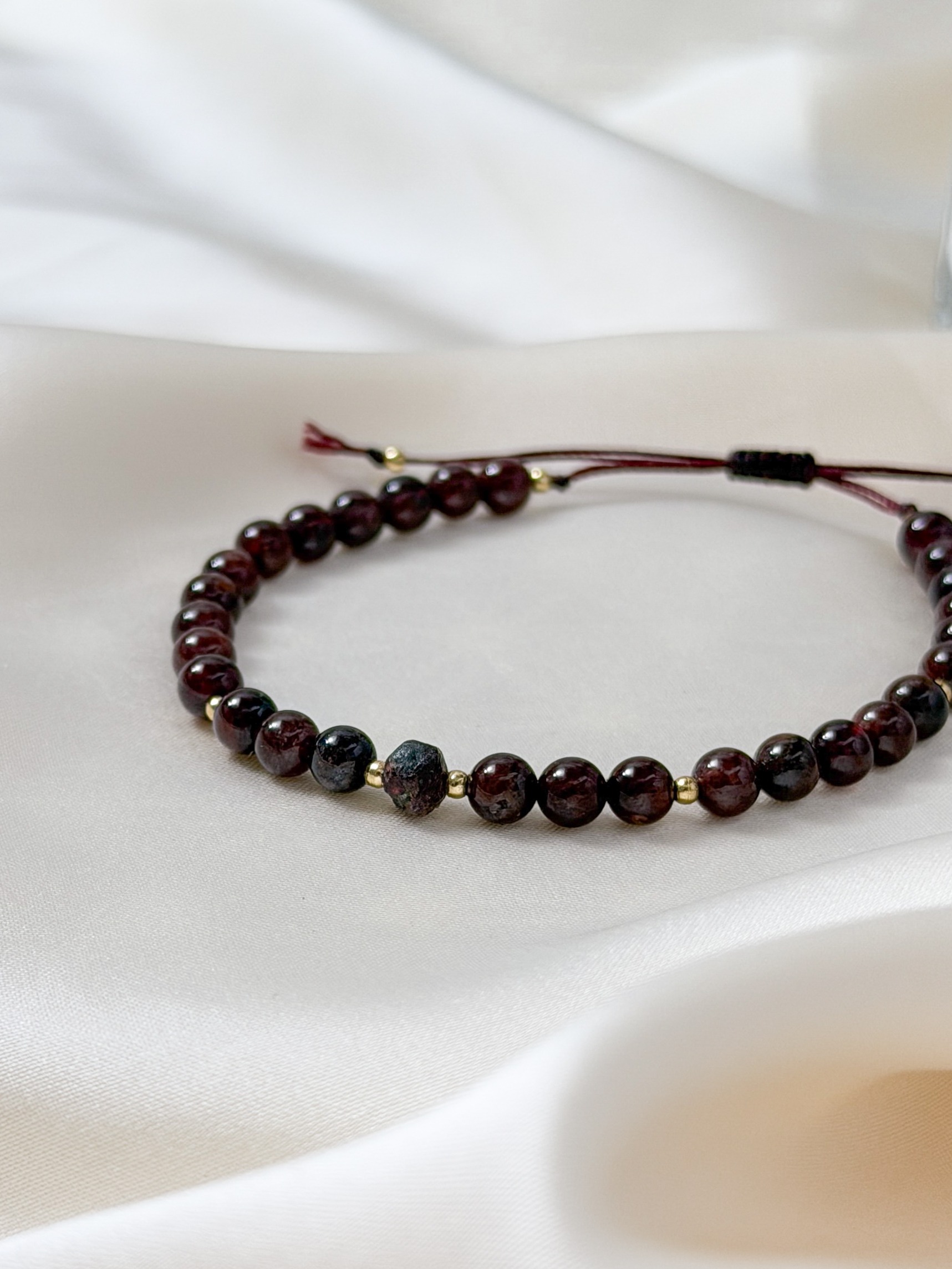 Urvertrauen steht für innere Sicherheit, Lebenskraft und die tiefe Verbindung zu den eigenen Wurzeln. Im Zentrum dieses Armbands sitzt ein roher Granat – unverfälscht, kraftvoll und bewusst naturbelassen. Er erinnert daran, dass Stärke nicht gemacht werden muss, sondern bereits da ist. Granat wird traditionell mit Erdung, Vitalität und innerem Halt verbunden. Er unterstützt dabei, sich selbst zu vertrauen, Entscheidungen aus dem Inneren heraus zu treffen und auch in herausfordernden Phasen standfest zu bleiben. Der rohe Mittelstein verstärkt diese Qualität und macht das Armband zu einem klaren Fokusstück.