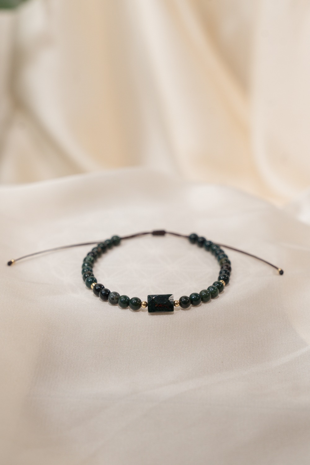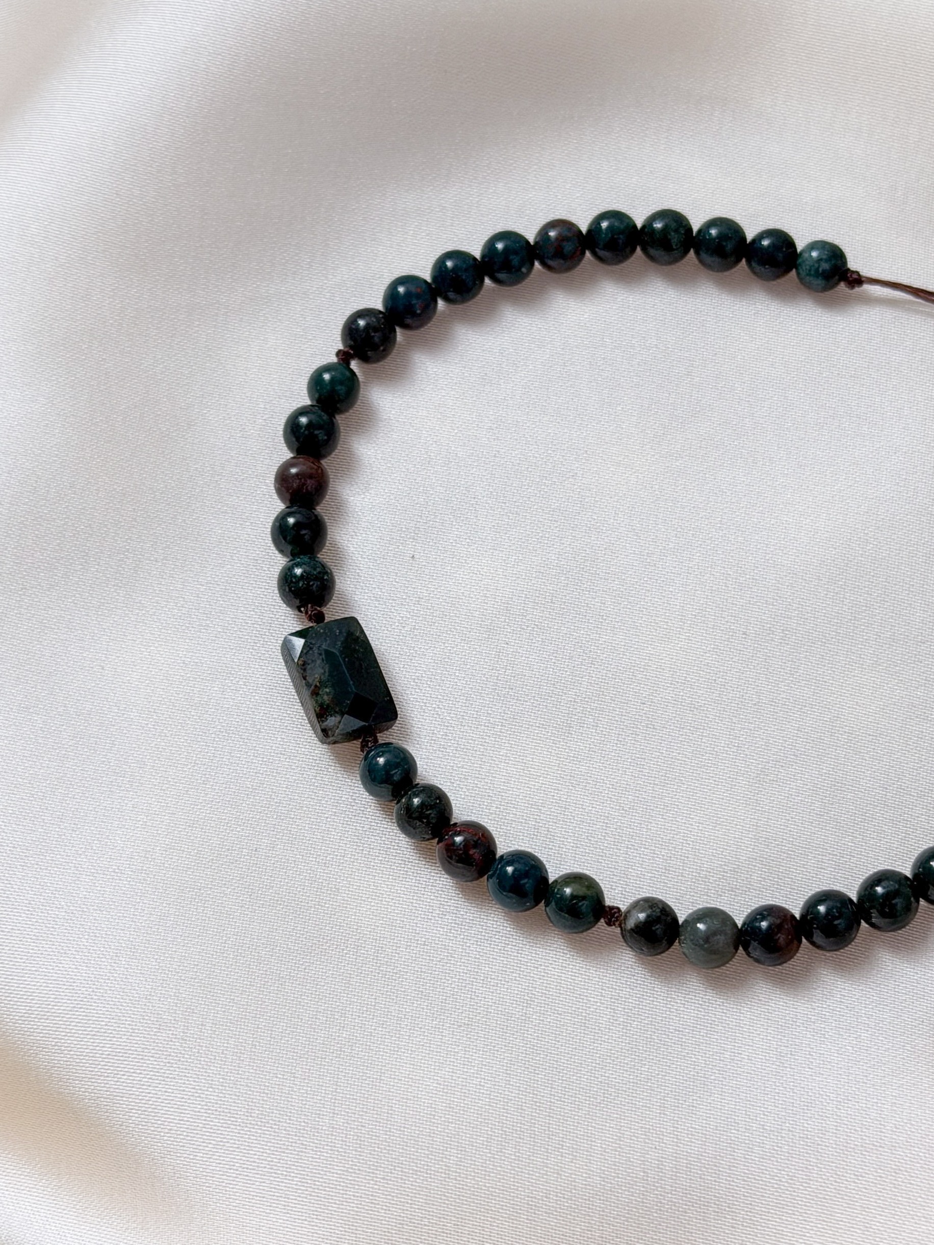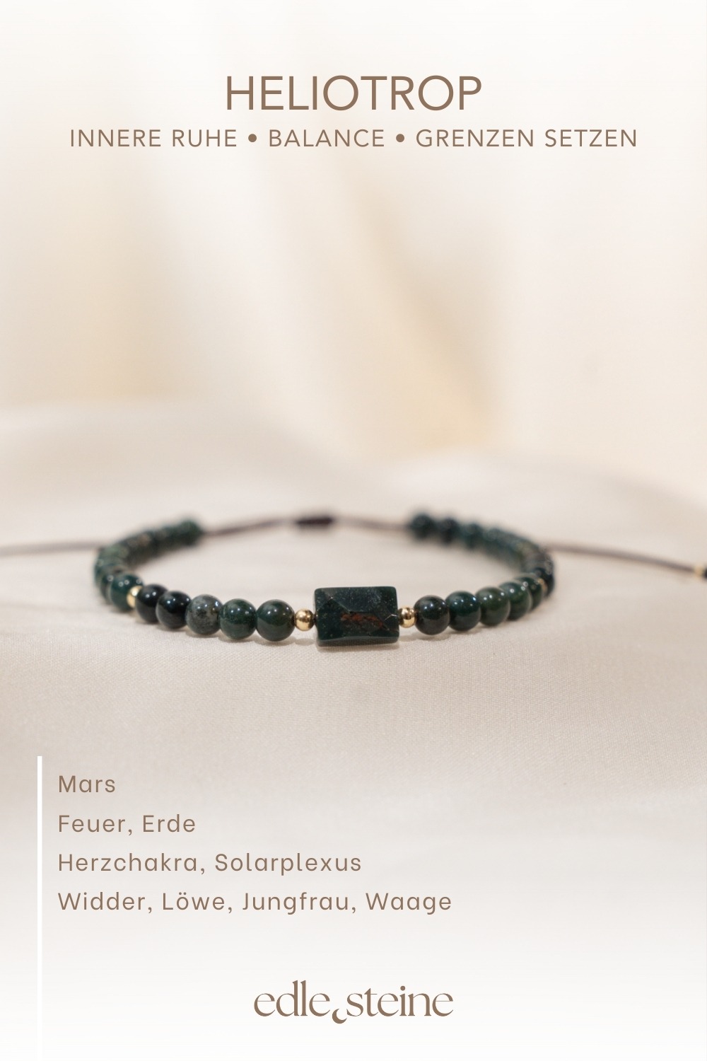 Der Heliotrop, auch als Blutjaspis bekannt, zählt zur Familie der Chalcedone und ist eine grüne Jaspis-Varietät mit roten Einschlüssen (Eisenoxid). Bereits in der Antike galt er als Schutzstein für Krieger und Heiler. Sein Name stammt aus dem Griechischen „helios“ (Sonne) und „tropos“ (Wendung) – einer Legende nach konnte er das Sonnenlicht beeinflussen. Heute wird er vor allem für seine stärkende und ausgleichende Wirkung geschätzt.