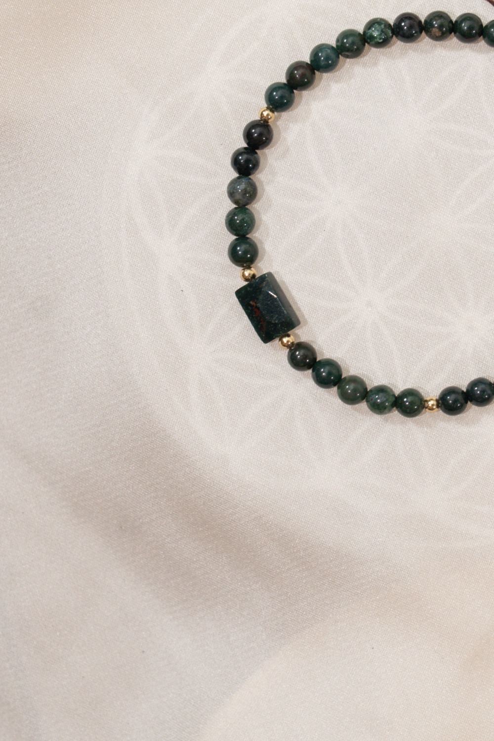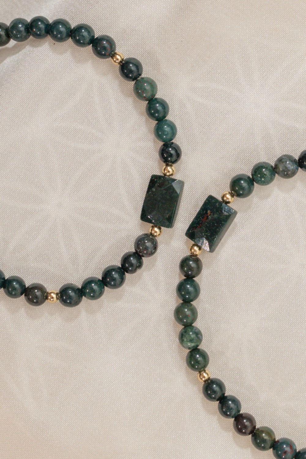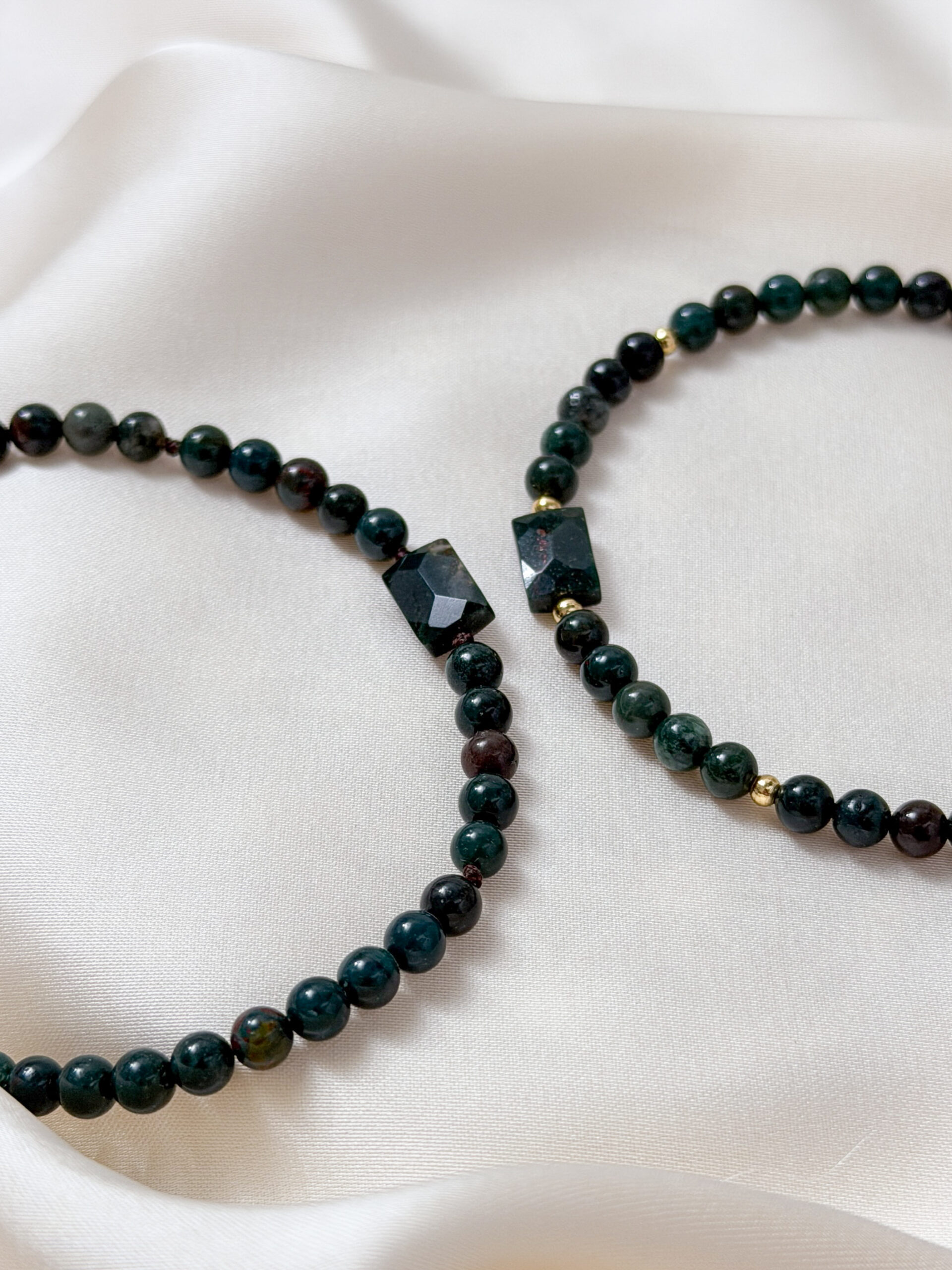 Der Heliotrop, auch als Blutjaspis bekannt, zählt zur Familie der Chalcedone und ist eine grüne Jaspis-Varietät mit roten Einschlüssen (Eisenoxid). Bereits in der Antike galt er als Schutzstein für Krieger und Heiler. Sein Name stammt aus dem Griechischen „helios“ (Sonne) und „tropos“ (Wendung) – einer Legende nach konnte er das Sonnenlicht beeinflussen. Heute wird er vor allem für seine stärkende und ausgleichende Wirkung geschätzt.