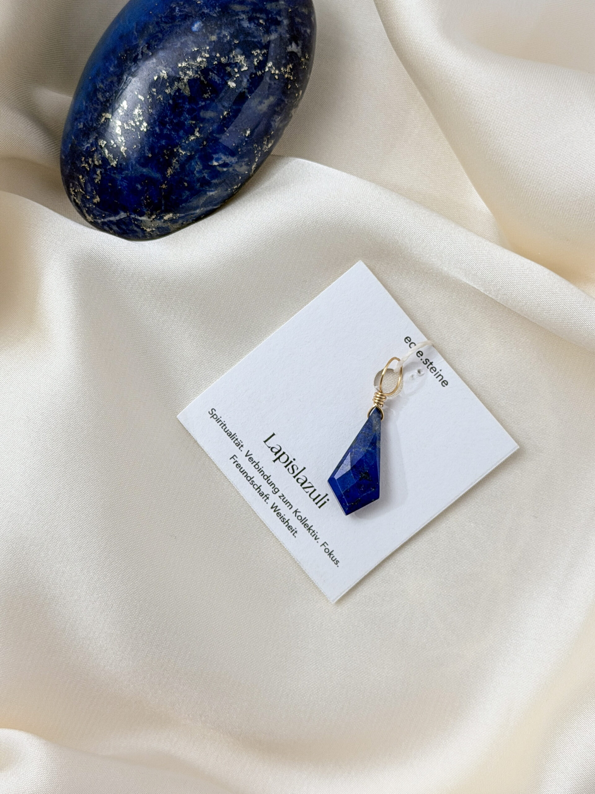 Lapislazuli ist ein tiefblaues Gestein, das vor allem aus den Mineralen Lazurit, Calcit und Pyrit besteht. Besonders geschätzt wird er für seine goldenen Pyrit-Einschlüsse, die wie Sterne am Nachthimmel funkeln.Schon im alten Ägypten galt er als „Stein des Himmels“. Er wurde zu Amuletten, Siegeln und Schmuck verarbeitet und war Symbol für Macht, spirituelles Wissen und innere Klarheit. In der Renaissance wurde er gemahlen und als Ultramarin das teuerste Pigment der Malerei – ein Symbol für Tiefe und Ewigkeit. Bis heute gilt Lapislazuli als Stein der Weisheit, der Wahrheit und der inneren Freiheit.