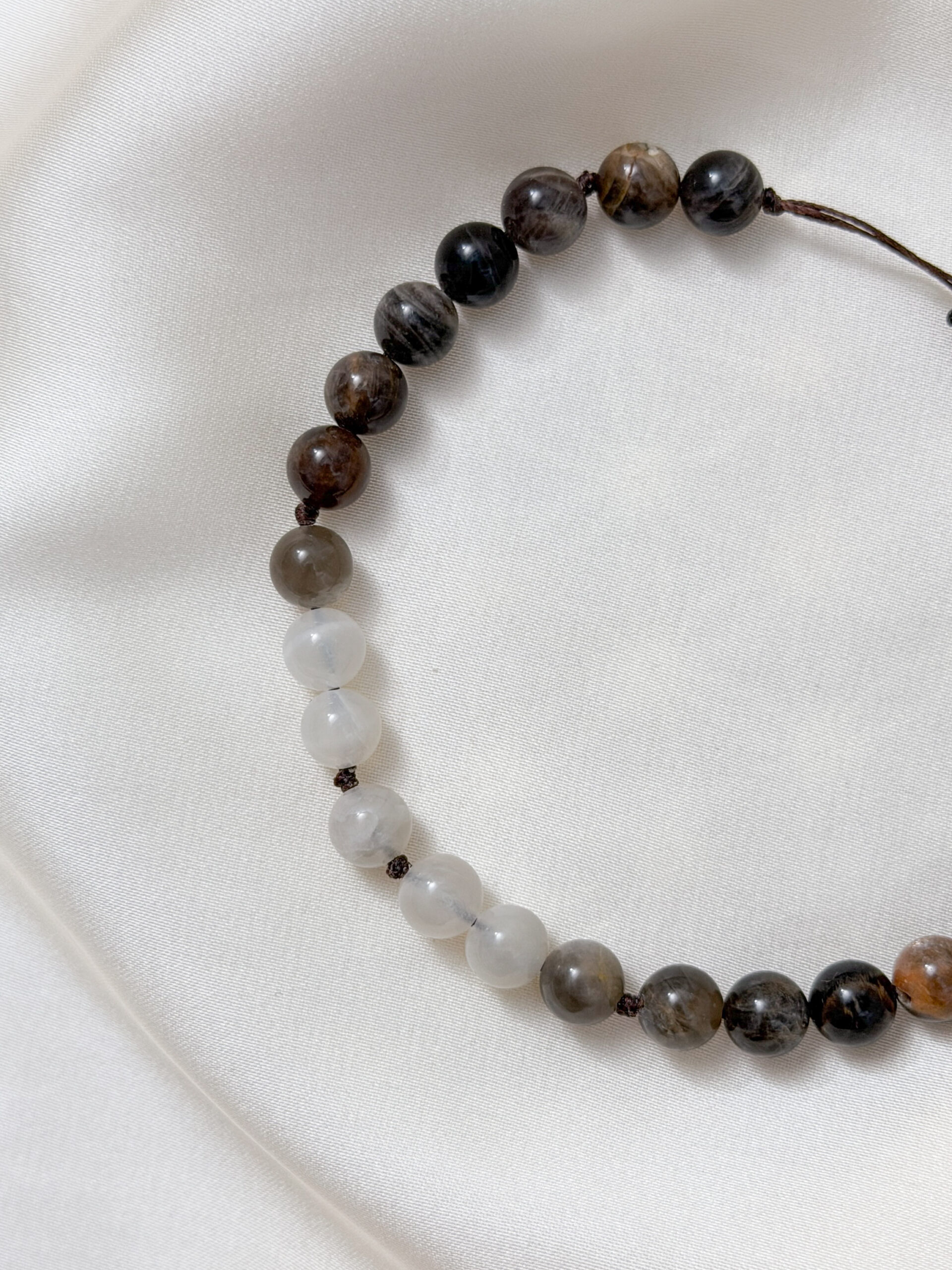 Mondstein ist ein Kalium-Aluminium-Silikat (KAlSi₃O₈) aus der Feldspatgruppe und bekannt für seine schimmernde Adulareszenz – ein Lichtspiel, das an das Leuchten des Mondes erinnert. Dieser Effekt entsteht durch Lichtbrechung an den lamellenartigen Strukturen im Inneren des Steins. Bereits die Römer glaubten, der Mondstein enthalte das gefrorene Licht des Mondes. In Indien wird er bis heute als Heilstein für Liebende verehrt und gilt als Symbol für Fruchtbarkeit und weibliche Weisheit.