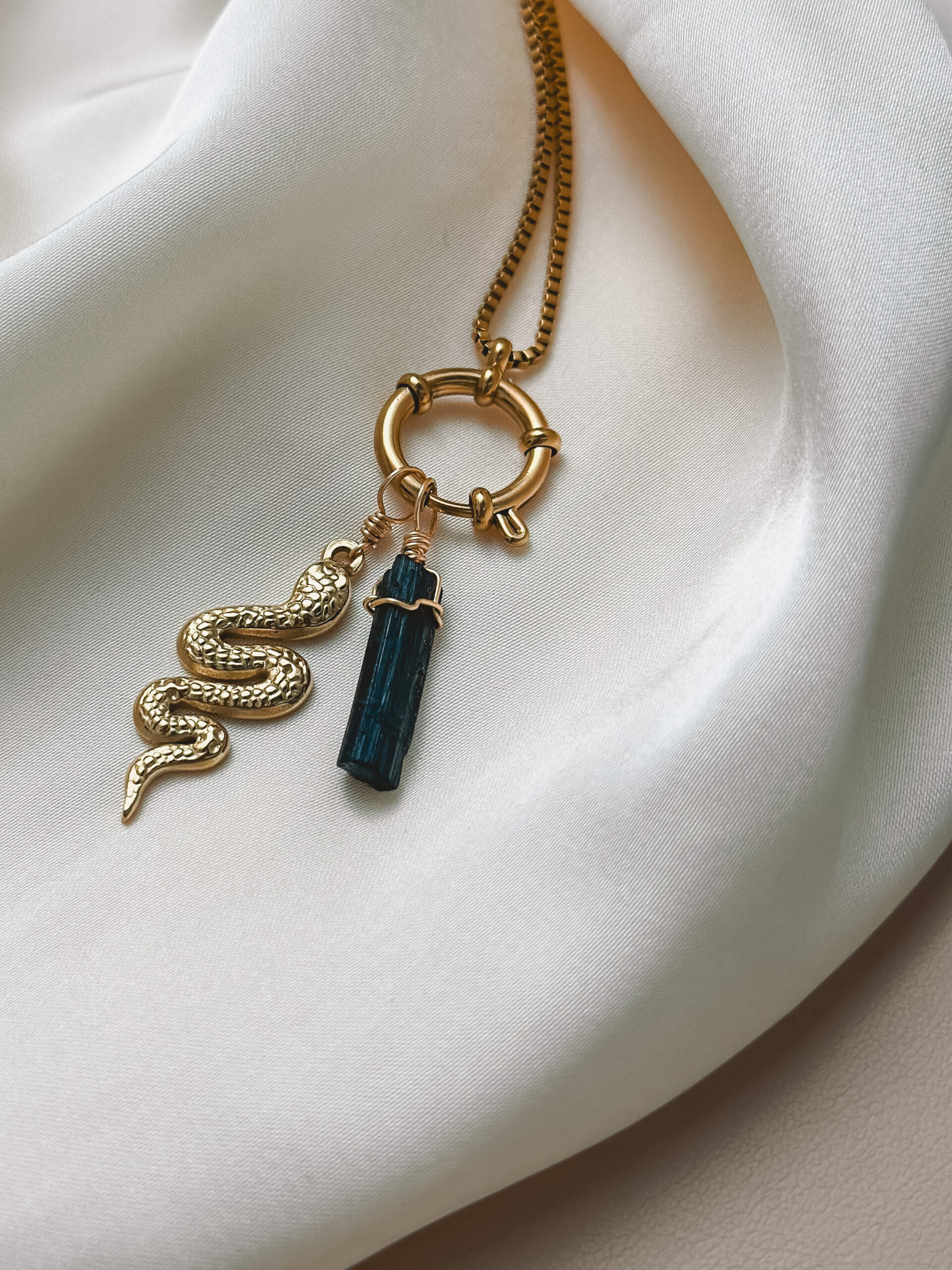 Die Schlange ist ein uraltes Symbol für Wandlung, Lebenskraft und spirituelles Erwachen. Sie streift ihre Haut ab – Schicht für Schicht – und erinnert dich daran, dass du dich immer wieder neu erfinden darfst. Im Yoga und in vielen spirituellen Lehren steht die Schlange für die Kundalini-Energie: eine schöpferische Kraft, die im Inneren ruht und darauf wartet, sich zu entfalten. Als Talisman begleitet dich die Schlange auf deinem Weg zu mehr Bewusstsein, innerer Klarheit und verkörperter Kraft. Sie steht für Erneuerung, Weisheit und das Vertrauen in deine natürliche Entwicklung.