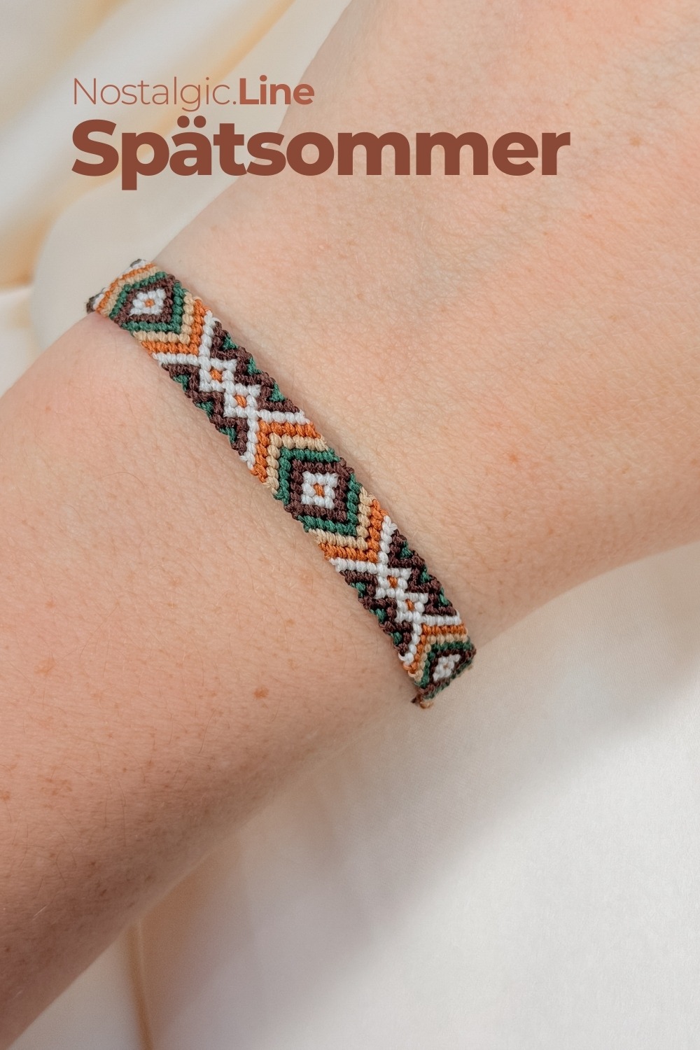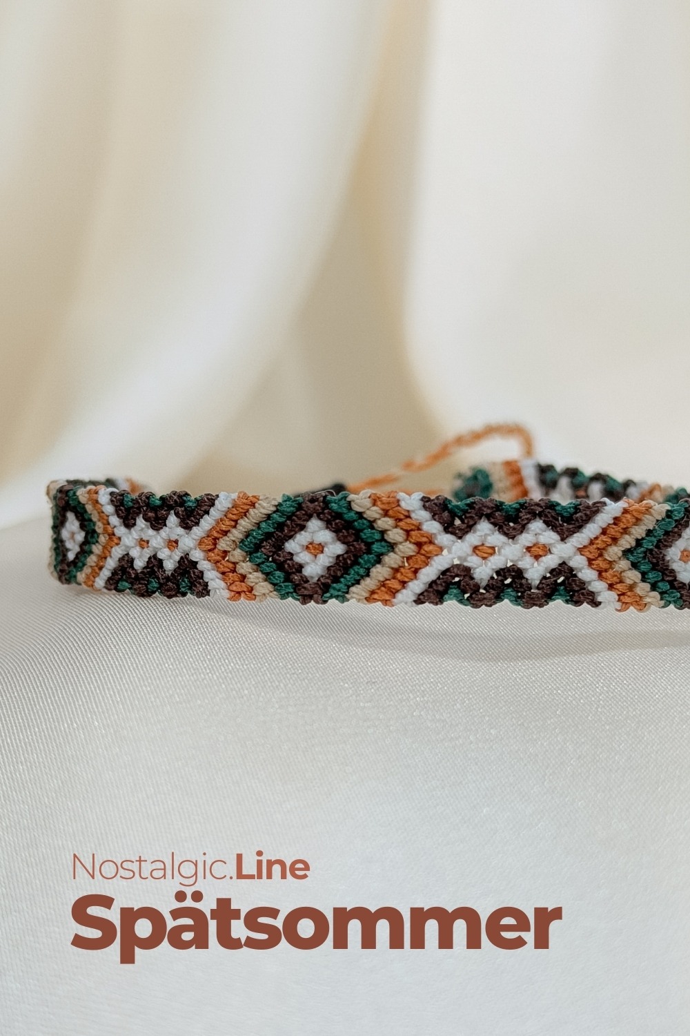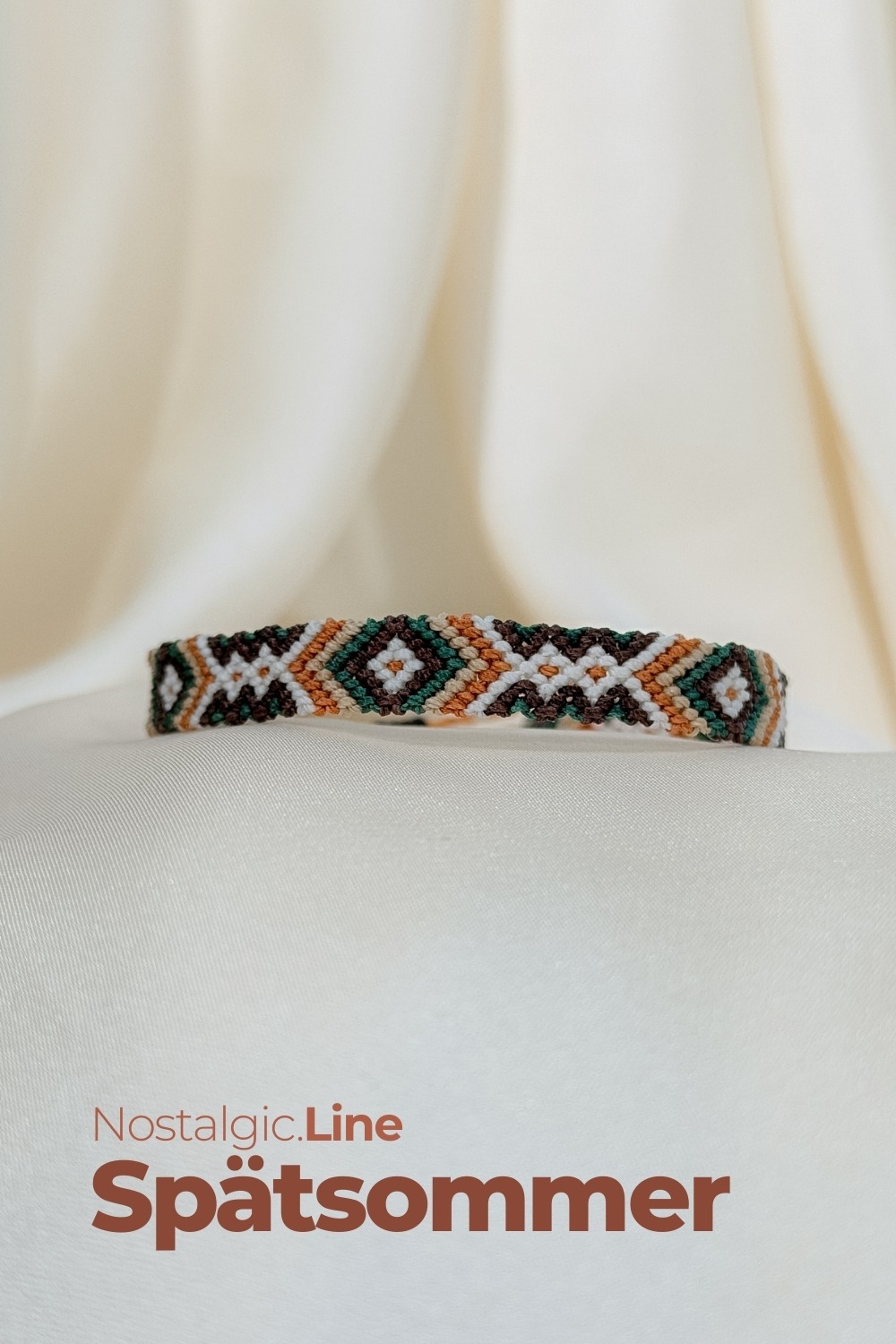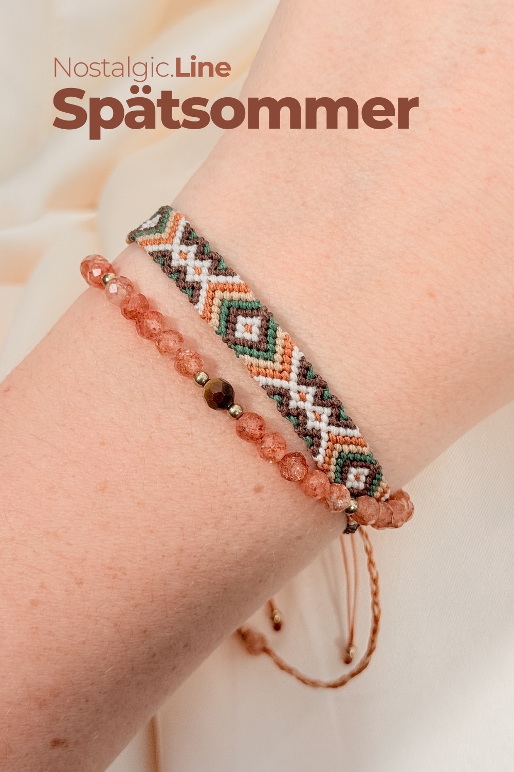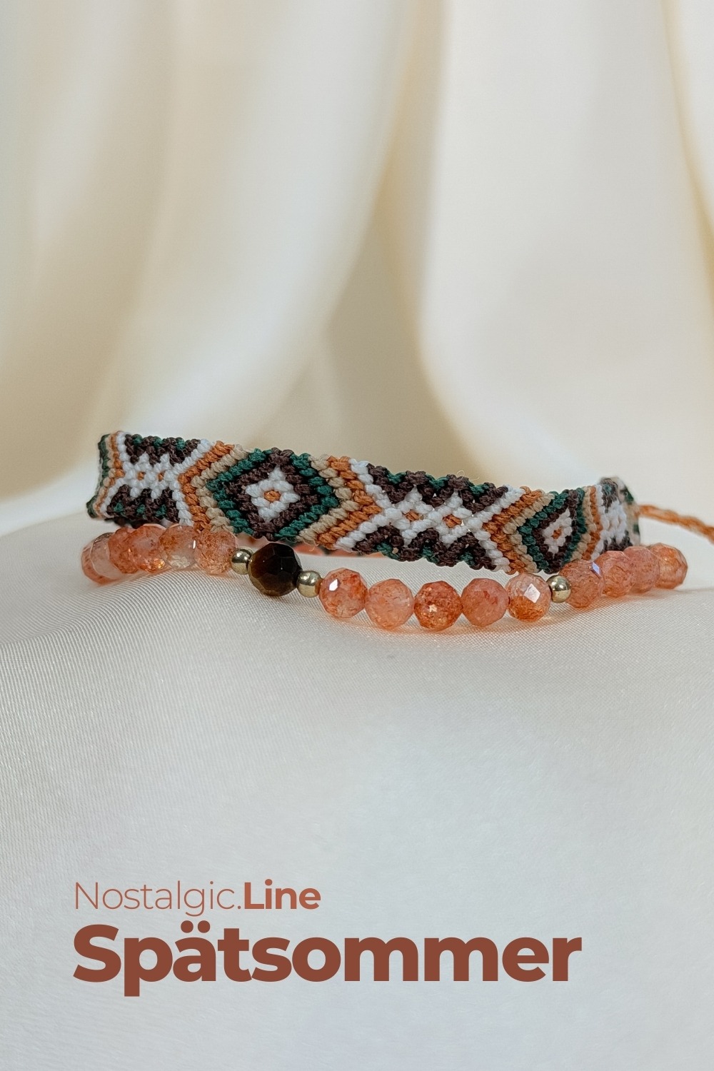 Ein Band wie ein warmer Abend, an dem die Luft leichter wird und das Licht goldene Spuren hinterlässt. Die warmen Erdtöne, das sanfte Grün und die hellen Akzente tragen genau diese Stimmung: ein leises Glühen, das an Spätsommertage erinnert, an denen alles ein wenig langsamer wird. An den Verschlussenden sitzt Sonnenstein – ein kleiner, warmer Lichtpunkt, der diese Energie noch einmal aufnimmt. Eine stille Erinnerung daran, wie sich Wärme anfühlt.