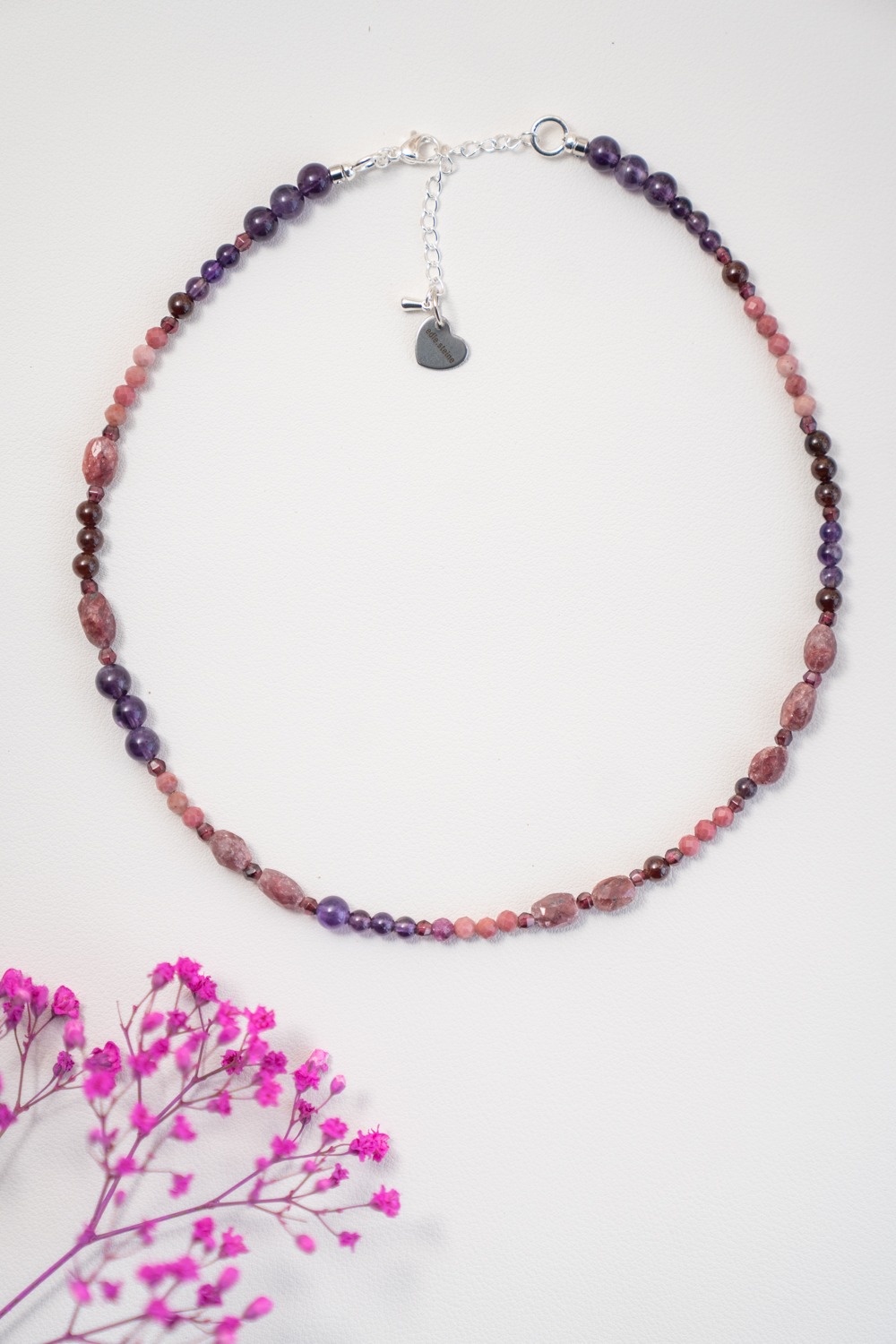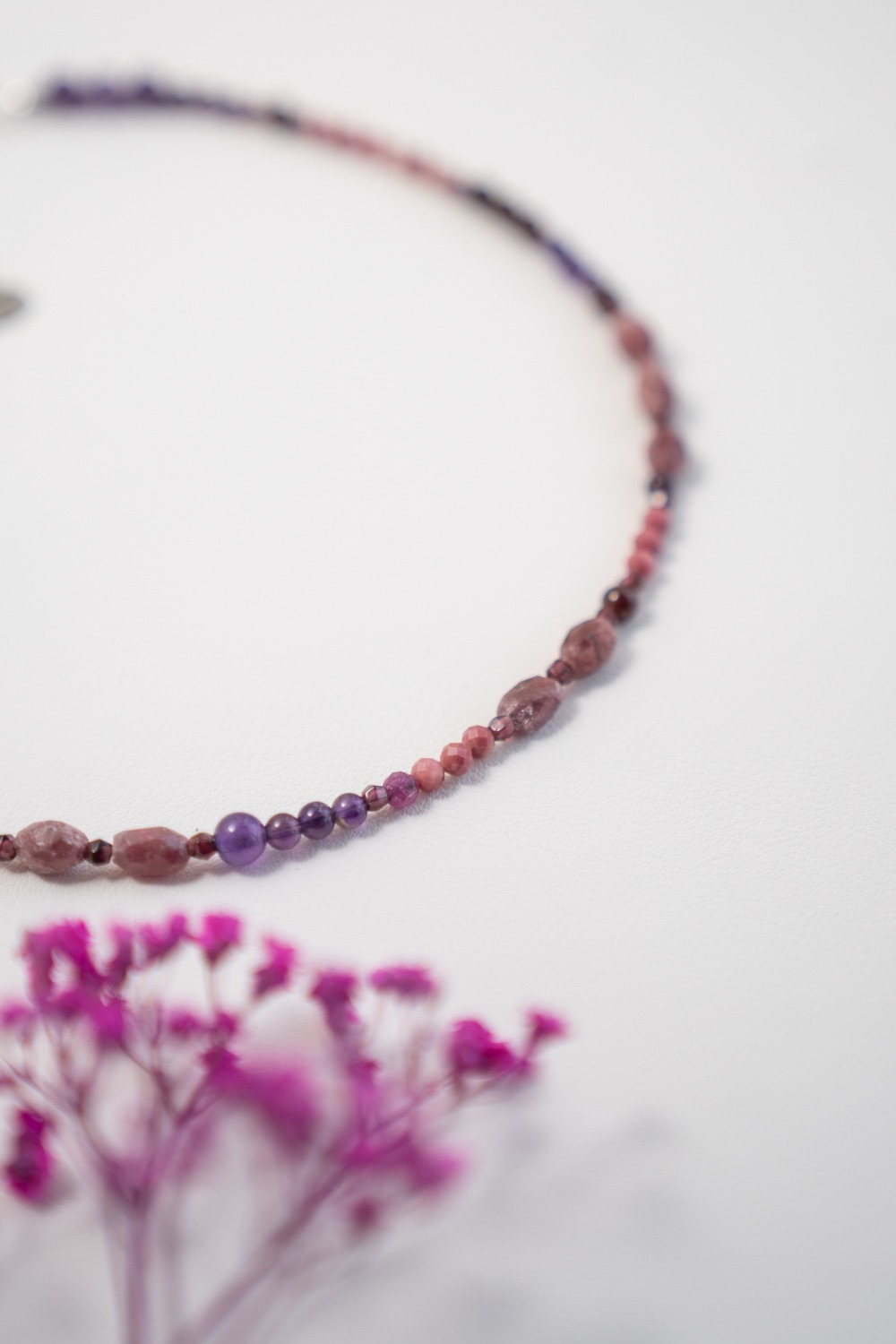 Diese Kombination wirkt wie eine Achse: unten die rohe Energie von Rubin und Granat, in der Mitte das Herz des Rhodonits, oben die geistige Klarheit des Amethysts. Eine Linie durch deinen Körper. Eine Linie durch deinen Weg. Urkraft ist für Menschen, die fühlen, handeln und wachsen wollen – ohne sich selbst zu verlieren.