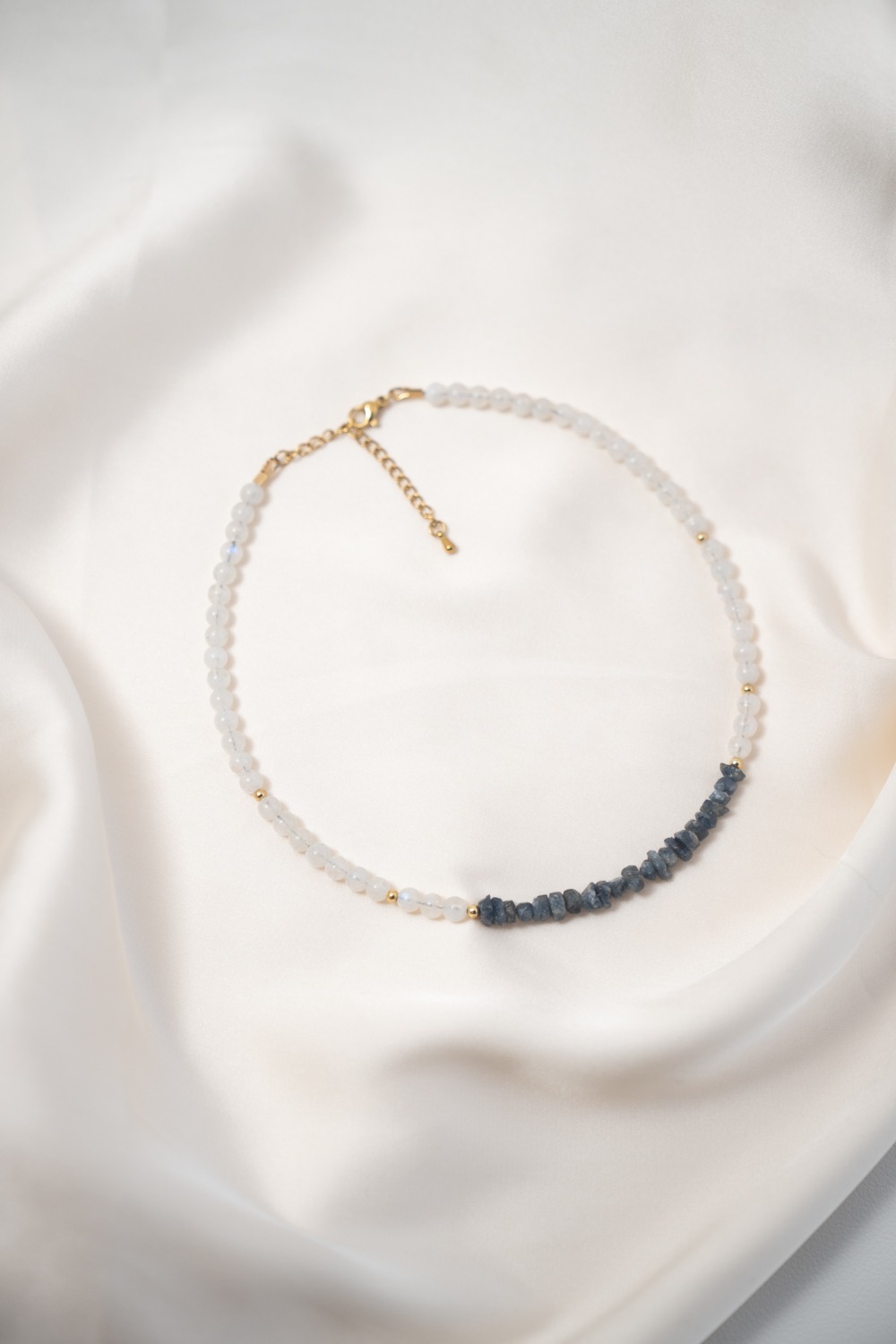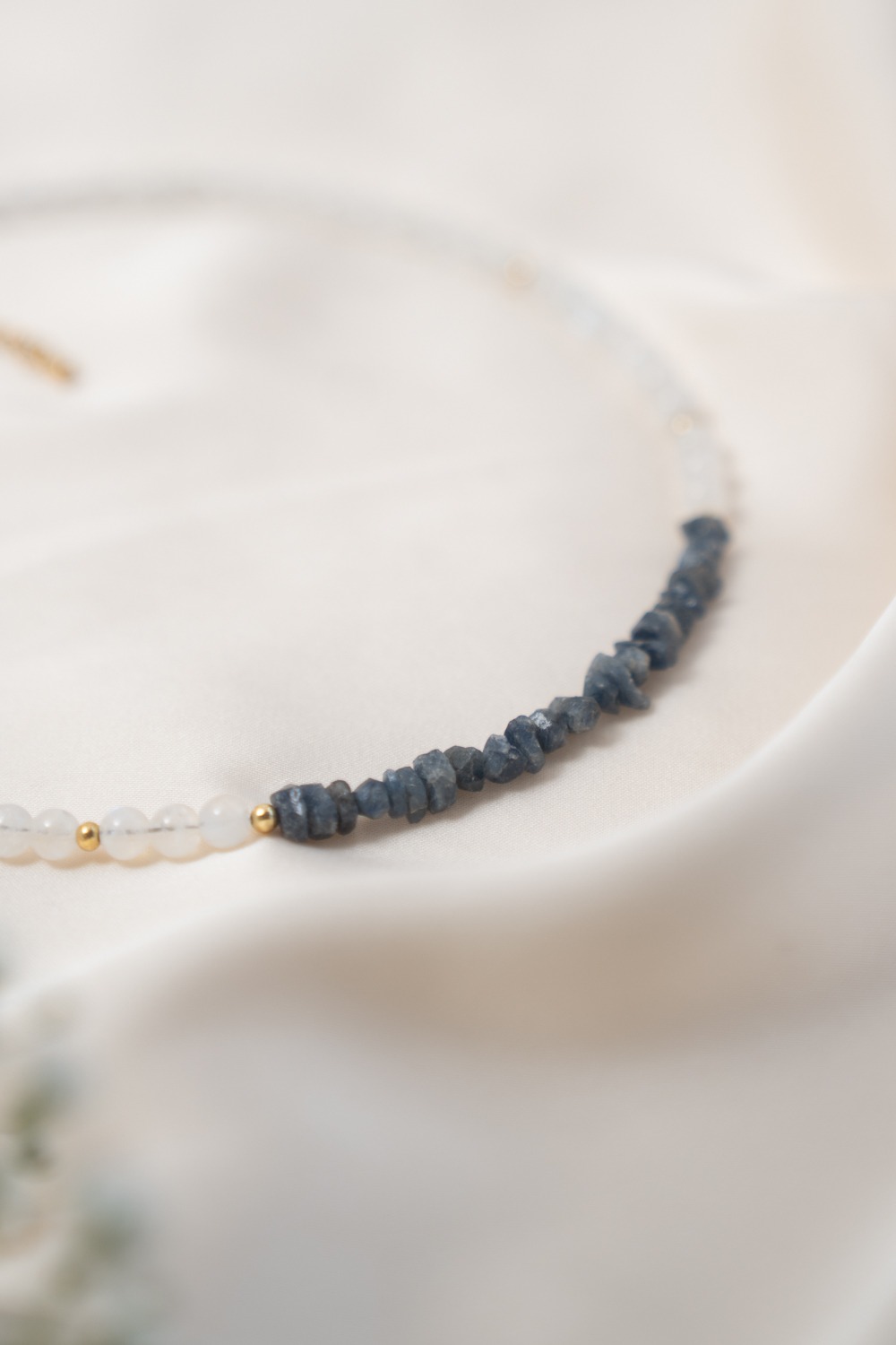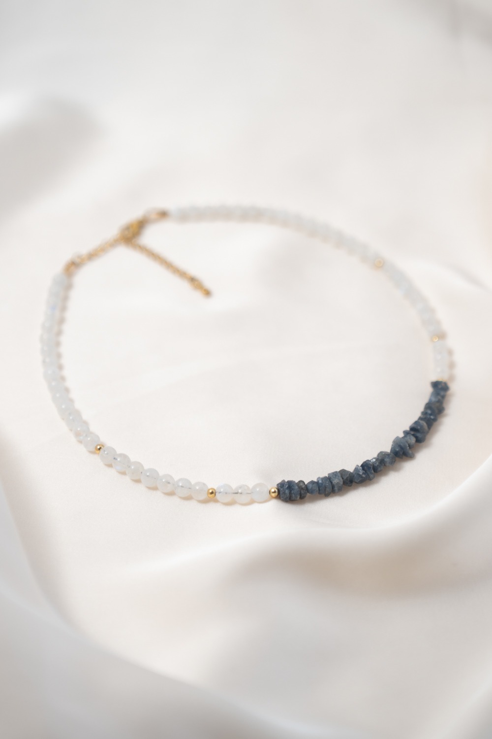 Wahrnehmung steht für das bewusste Spüren – ohne sich darin zu verlieren. Für innere Ruhe, die nicht aus Rückzug entsteht, sondern aus Balance. Diese Kette verbindet emotionale Tiefe mit geistiger Klarheit und erinnert dich daran, dass Körper und Geist zusammenarbeiten dürfen, statt gegeneinander. Saphir bringt Stabilität in bewegte Phasen. Er unterstützt emotionale Balance, Wachstum und die Verbindung von Körper und Geist. Regenbogen Mondstein öffnet für Gefühlsausdruck, Inspiration und Selbstwert. Er erinnert dich daran, dich nicht kleiner zu machen, als du bist – und deiner Wahrnehmung zu vertrauen.